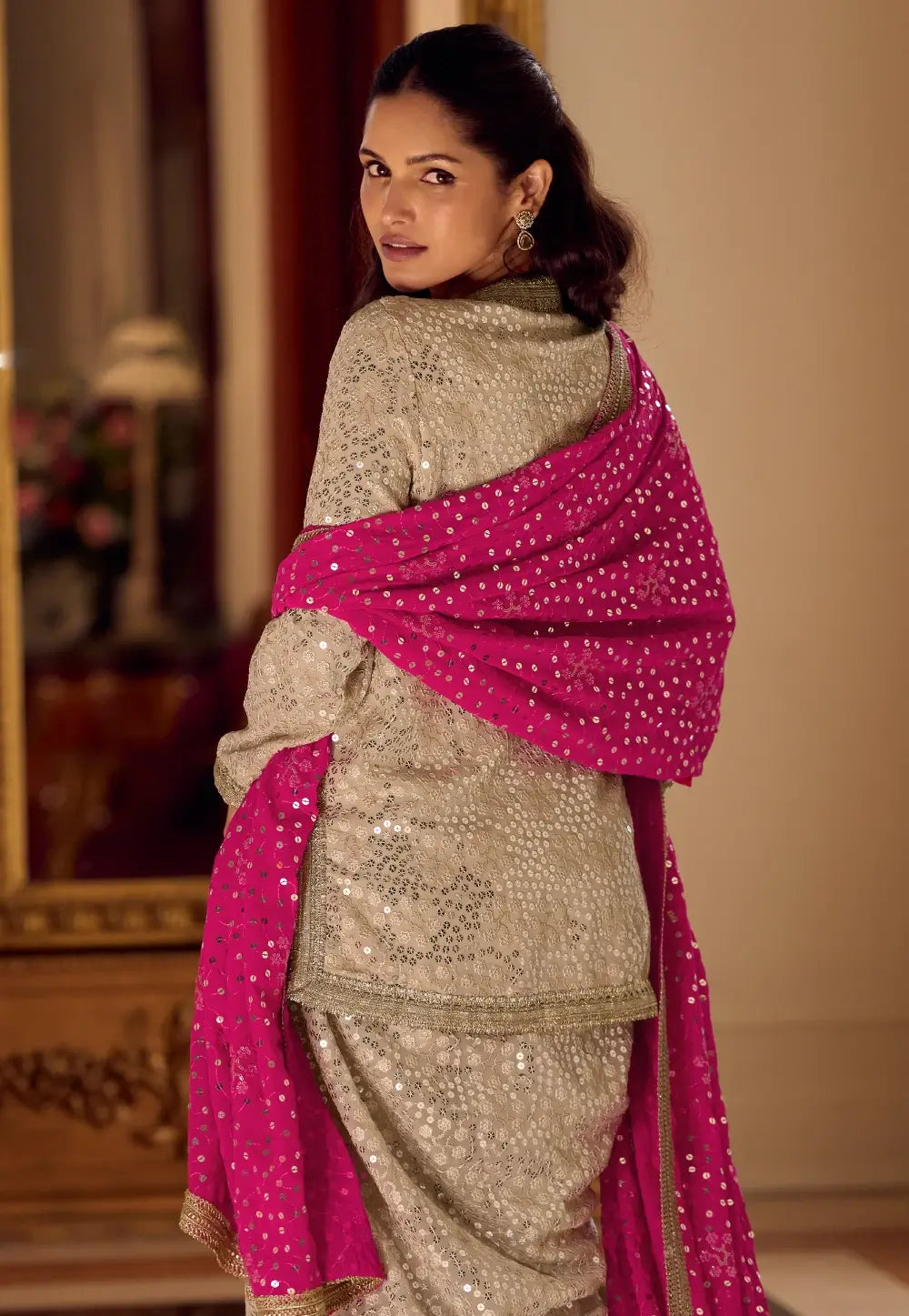 Elevate your festive style with this luxurious Real Georgette ensemble, featuring a fully hand-embroidered top paired with an elegant dhoti pant for a graceful draped look. The intricate detailing across the outfit enhances its rich, premium appeal. Complementing the set is a vibrant, heavy embroidered dupatta available in stunning contrasting shades perfectly matching the style. The mirror work and handcrafted embellishments add a glamorous festive shine. Designed with premium finishing and flawless craftsmanship, this outfit is ideal for weddings, sangeet, and special celebrations. A true statement piece crafted with precision.